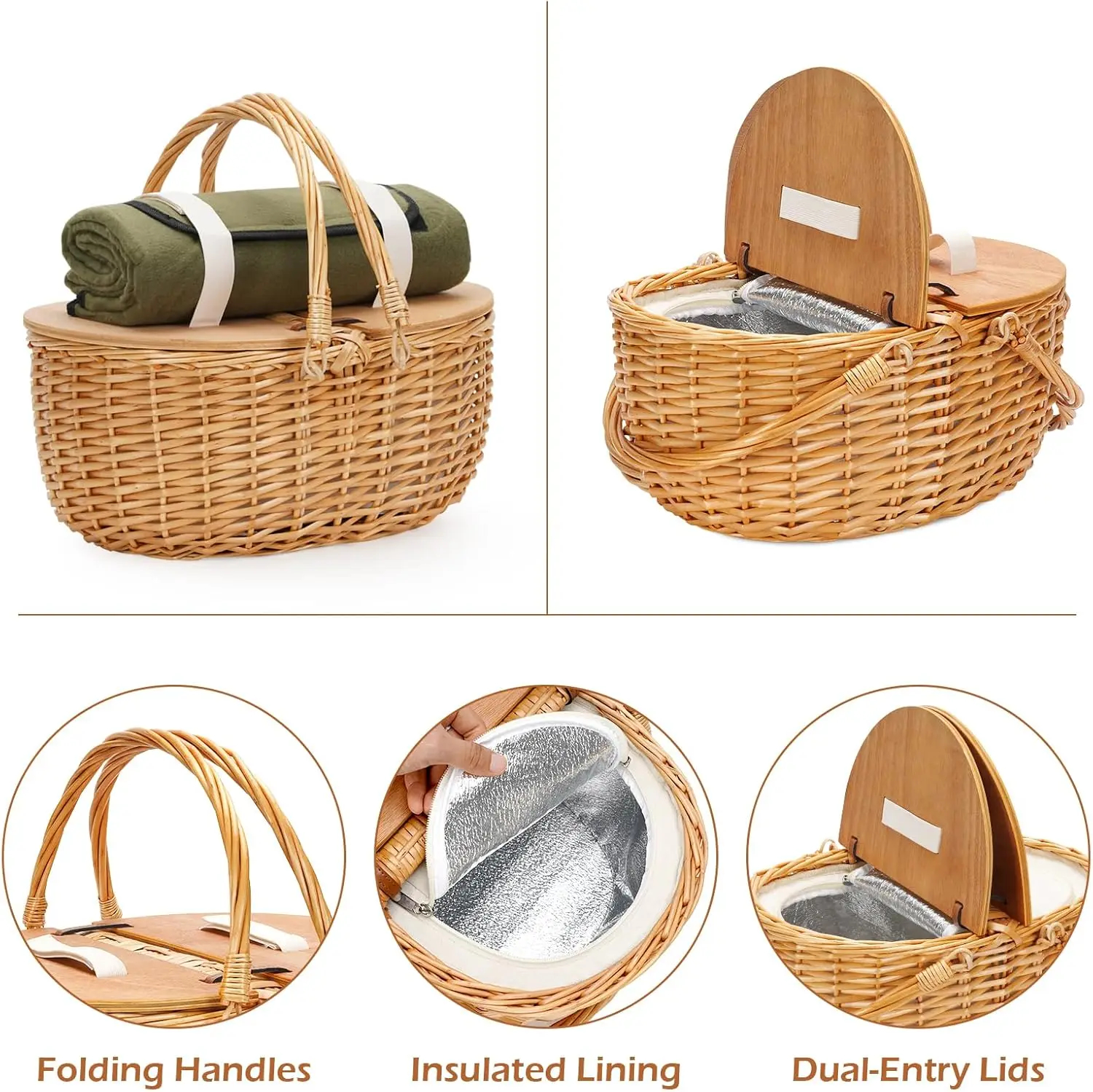 Create unforgettable outdoor memories with this beautifully handcrafted wicker picnic basket designed for two. This vintage-style picnic hamper combines classic charm with modern functionality, featuring an integrated insulated cooler compartment, removable waterproof blanket, and elegant wooden split lid that transforms into a serving surface.